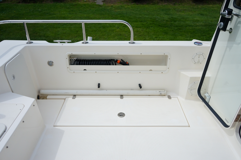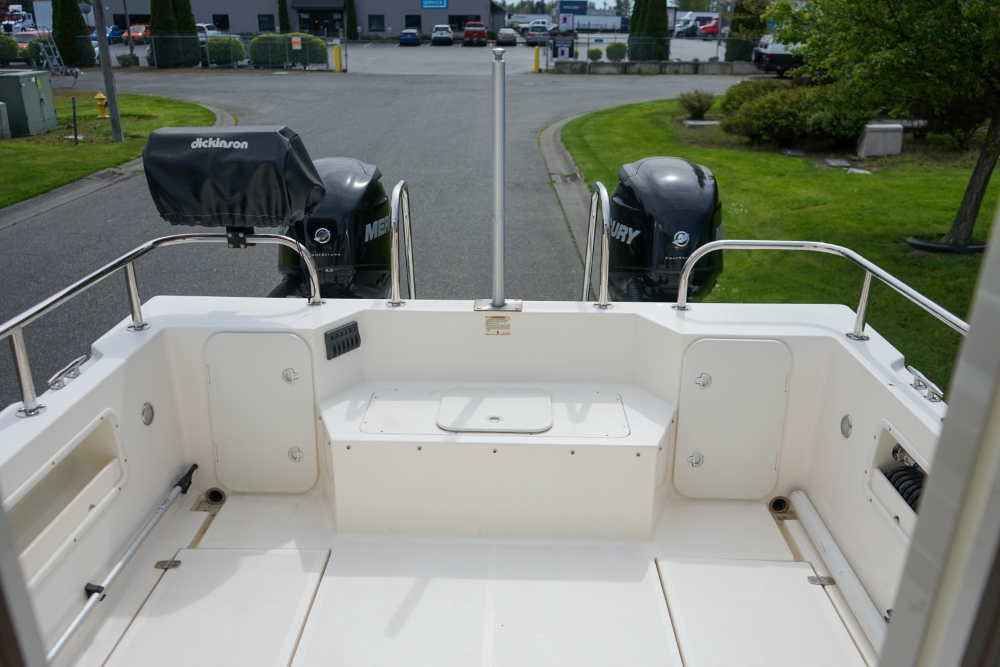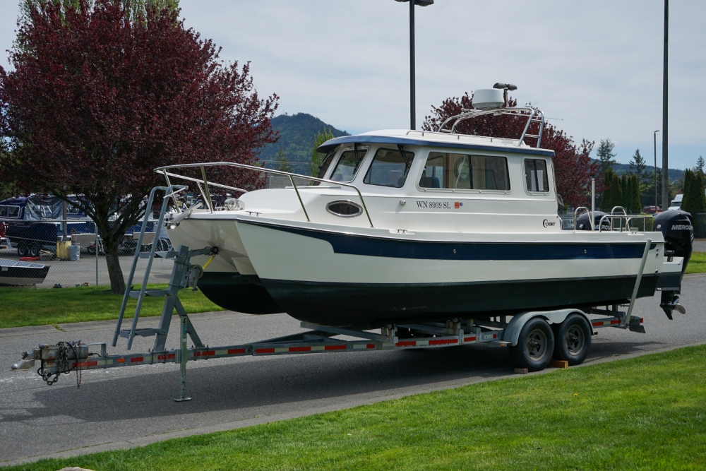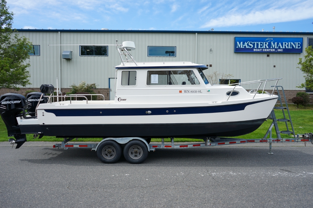 This used 2018 C-Dory 25 TomCat is a 25-foot catamaran built for stability, efficiency, and all-weather cruising with a wide 8’6” beam and twin hull design that delivers a smooth, level ride even in rough conditions. It’s typically powered by twin outboards and carries around 100 gallons of fuel, giving it solid range for longer trips, while still being trailerable. The layout includes a fully enclosed pilothouse with large windows for visibility, a dinette that converts to a berth, a forward V-berth, and an enclosed head, making it well suited for overnight use. The cockpit is open and functional for fishing or gear, and the catamaran design adds extra deck space and stability at rest, making it a practical setup for cruising, fishing, or extended time on the water.