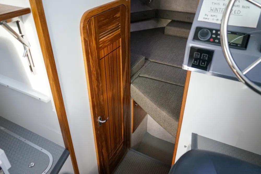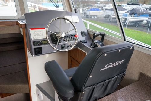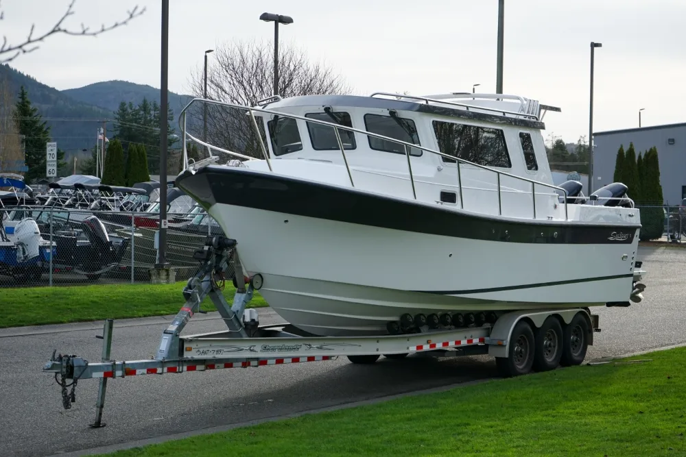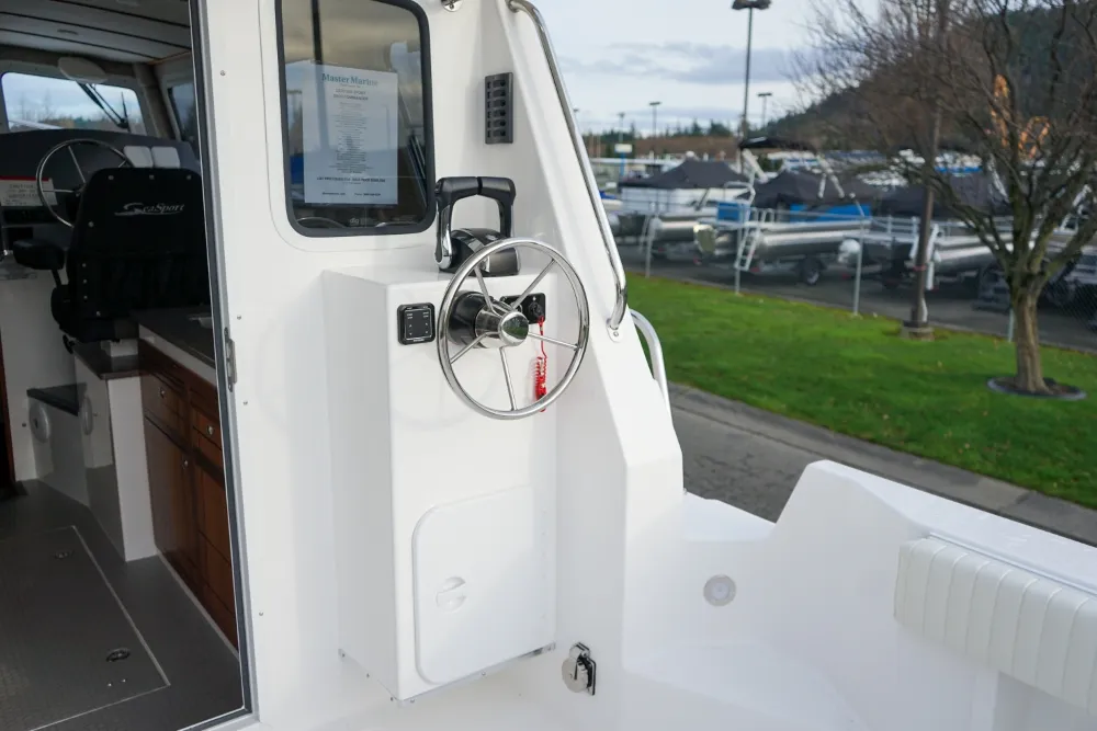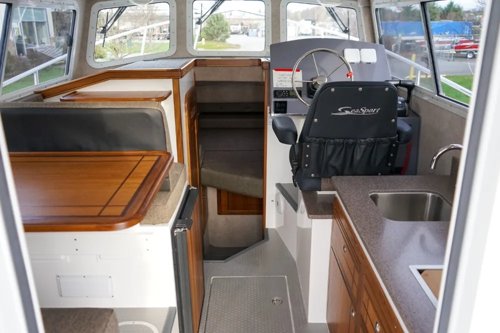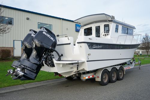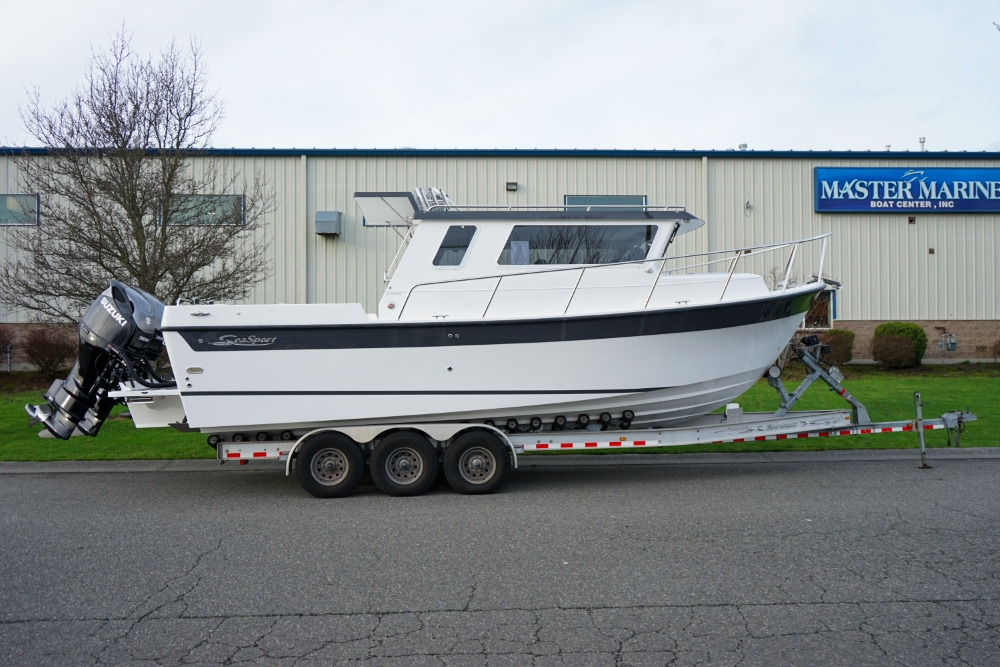 The Sea Sport Commander 2800 is a 28-foot trailerable cabin cruiser that combines rugged seaworthiness with practical comfort, ideal for both serious fishing and family cruising. With a beam of 9'9"", it offers a spacious interior that includes a forward quarter-berth, a full galley (2-burner propane cooktop, deep sink with hot & cold water, 3.5 cu ft refrigerator), and a comfortably enclosed electric marine head plus a hot-water shower. The cabin sleeps up to six people, thanks to a V-berth, dinette that converts to a berth, and a port-side aft stateroom. Built with a 22° deadrise hull, stainless-steel bow rail, non-skid deck, and self-draining cockpit, it’s designed to take on rough water. Standard features also include hydraulic steering, trim tabs, a built-in livewell, and a durable aluminum windshield with tempered glass. With a 300-gallon fuel tank, 60-gallon water tank, dual-battery setup (one for house power, one for start), and ABYC / USCG certification, the Commander 2800 is a true dual-purpose boat, comfortable for cruising, and capable enough for fishing.