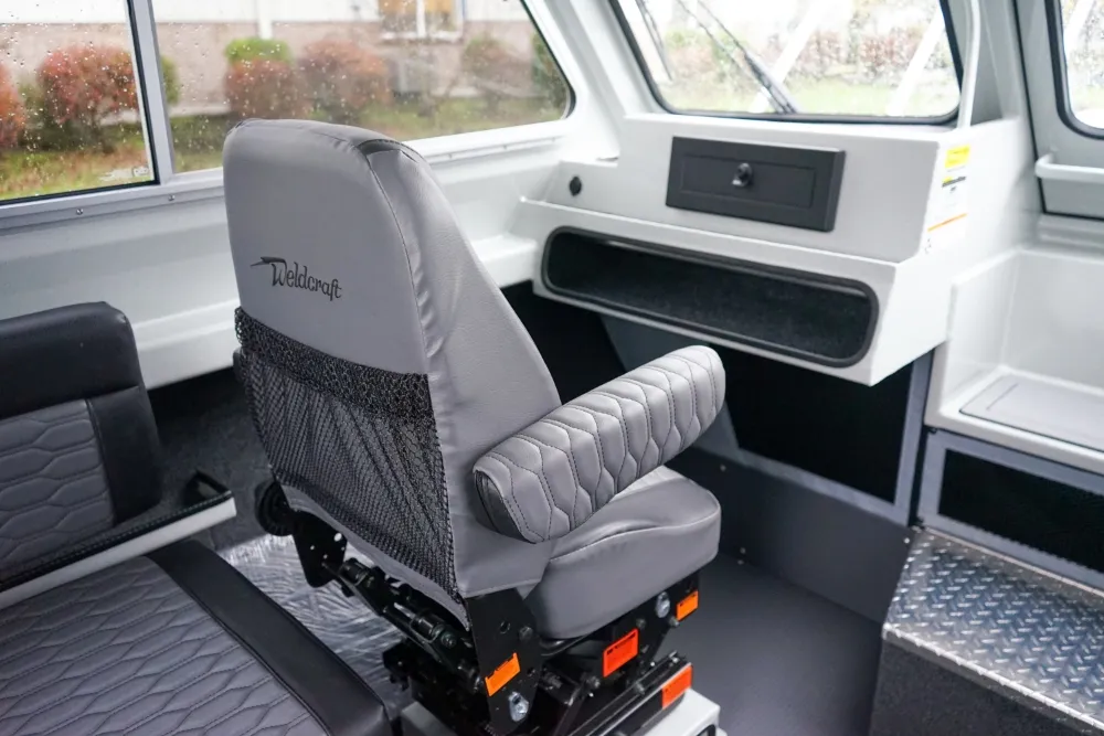 The Weldcraft 220 Ocean King is built for serious big-water use, combining a steep deep-V bow, tall sides, and heavy-gauge aluminum construction to deliver a confident, dry ride in rough conditions. It stretches just over 25 feet with an offshore bracket and wide swim platform, and it’s loaded with practical fishing features like an insulated floor fish box, a large transom fish box with a cutting board, wide gunwales, and a self-bailing bow with a big storage box. Inside, the hard-top cabin offers protection and good visibility, with sliding windows and flexible seating that can be set up for longer days on the water. With an 84-gallon fuel tank and power ratings up to 300 HP, the Ocean King is designed for anglers and coastal boaters who want strength, range, and comfort in one straightforward package.